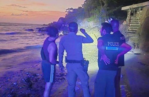 Die Tatverdächtigen wurden in einem Bungalow festgenommen. Das Foto oben zeigt Polizisten am Tatort am Strand von Koh Phangan. © Polizei Koh Phangan (2)