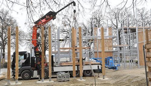 Ist denn schon wieder Wiesn-Aufbau? Im nördlichen Teil der Theresienwiese hievt ein Kran Holz- und Stahl-Elemente in die Luft. Doch das Gebilde wird kein Zelt – sondern ein nagelneuer Spielplatz. Das Großsp