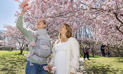 Daniela Pawlak (re.) und Anne Kirchner staunen über die Kirschblüte im Olympiapark. © Oliver Bodmer (2)