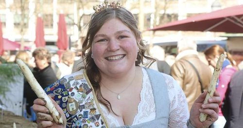 Freut sich auf die Spargelzeit: Spargelkönigin Elisabeth IV. auf dem Viktualienmarkt. © Markus Götzfried