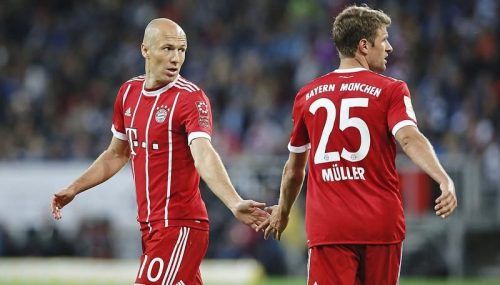 Thomas Müller trägt seit Jahren die 25, hier mit Arjen Robben im Jahr 2017. © firo/Sebastian El-Saqqa