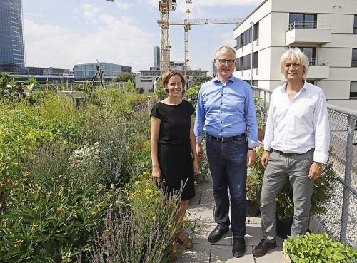 Vertreter verschiedener Genossenschaften bei einem Rundgang auf dem Dach des Genossenschafts-Neubaus im Münchner Westen. © Oliver Bodmer, Heimstättenbaugenossenschaft