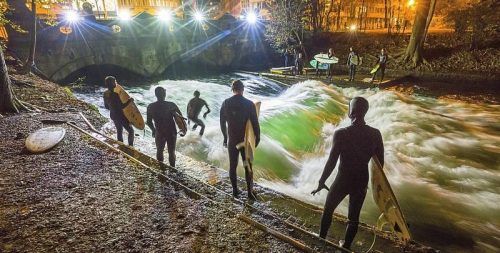 Surferin Sophie Wilckens ist kürzlich mit ihrem Board ebenfalls am Grund des Bachs hängen geblieben. Die Leine am Surfboard (Leash, Foto re.) soll verhindern, dass das Brett wegschwimmt – es ist aber auch ein Sicherheitsrisiko beim Flusssurfen. © Oliver Bodmer (2)