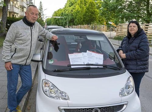 Stefan und Renate Heim mit ihrem Smart in der Burgkmairstraße – und den fünf Bußgeldbescheiden hinterm Scheibenwischer.