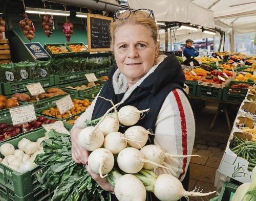 Petra Hahn mit ihren Mairübchen. Seit 39 Jahren leitet sie ein Standl auf dem Viktualienmarkt. © Jens Hartmann