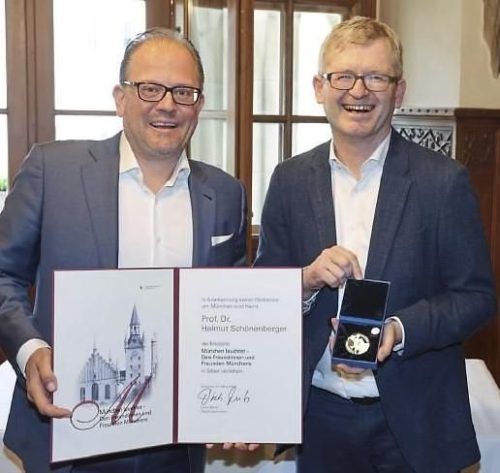 Professor Helmut Schönenberger von der TU München hat die Medaille „München leuchtet“ in Silber erhalten. Stadtrat Manuel Pretzl (li.) überreichte ihm die Auszeichnung während einer Feier im Rathaus. Schönenberger ist Mitgründer und Geschäftsführer von UnternehmerTUM, jenem Innovations- und Gründerz