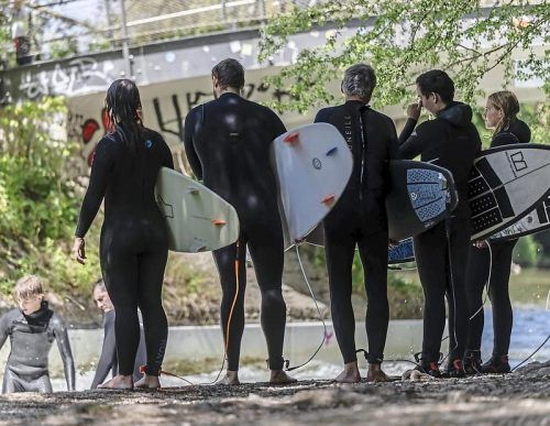 Münchner Surfer warten auf den nächsten Ritt. Mit Leinen sind die Bretter mit dem Körper verbunden. © Yannick Thedens
