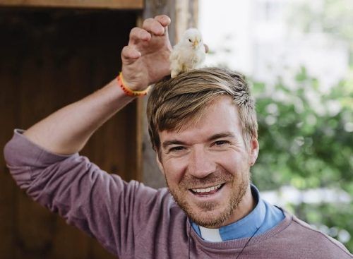 Pfarrvikar Georg Schweizer mit einem der Küken auf dem Kopf: Im Pfarrgarten von St. Peter und Paul in Trudering passierte das Küken-Wunder – fünf Jungvögel schlüpften aus Supermarkt-Eiern. © Jens Hartmann (3)