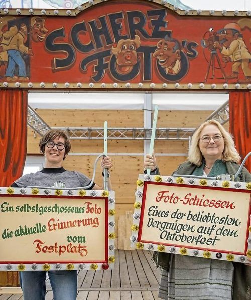 Mascha Erbelding (l.) und Yvonne Heckl beim Aufbau der Ausstellung im Museumszelt mit Werbeschildern fürs Fotoschießen. Das Foto rechts zeigt ein Scherzfoto aus dem Jahr 1964. © Achim Schmidt
