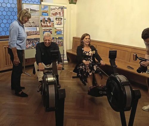 Sie legen sich ins Zeug: OB Reiter und Bürgermeisterin Dietl testen die Rudermaschinen.