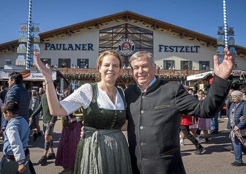 Christine und Lorenz Stiftl vorm Paulaner-Festzelt. Auf der Wiesn 2026 übernehmen sie hier selbst. © Achim Schmidt
