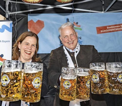 Kein Problem beim Masskrugstemmen hatten Bürgermeisterin Verena Dietl (SPD) und Dehoga-Kreischef Christian Schottenhamel. © Oliver Bodmer