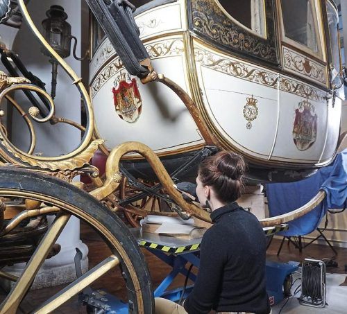 Die viersitzige „Berline“, 1816/17 in Karlsruhe gebaut, besticht durch ihre ungewöhnliche weiße Lackierung und wird jetzt restauriert. © Bayerische Schlösserverwaltung
