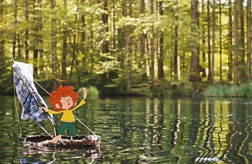 „Wenn der Sturmwind in die Segel bläst…“ Pumuckl sticht mit dem von Meister Eder (Florian Brückner, o. re.) gebastelten Unterhosensegel in See. © Con