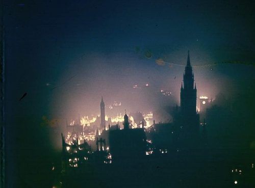 Das Farbdia von Clemens Bergmann zeigt das Neue Rathaus vor brennender Stadt (1943/44). Seine Fotos schoss Bergmann v
