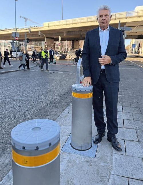 Absicherung der Gefahrenstelle: Oberbürgermeister Dieter Reiter an den neuen Pollern.