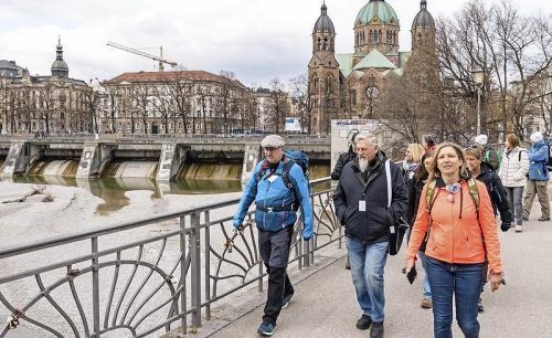 Auf in ein neues Abenteuer: Tourguide Imke Ewald (rechts) unterwegs mit unseren Zeitungsgewinnern bei der Single-Wanderung am Isar-Wehrsteg. © Oliver B