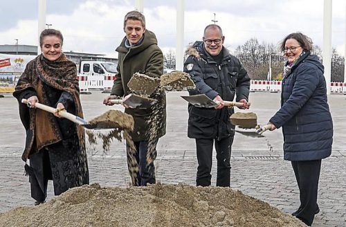 Der künftige OB Dominik Krause setzt am Willy-Brandt-Platz in Riem mit Baureferentin Jeanne-Marie Ehbauer (li.), BA-Chef Stefan Ziegler (2. v. re.) und Friederike Fuchs von der Bezirksregierung den Spa