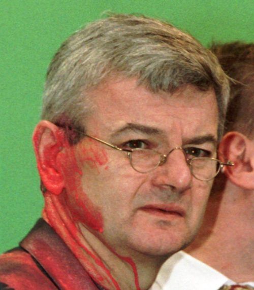 Berlin – Es war einer der wichtigsten und mit Sicherheit der spektakulärste Parteitag in der Geschichte der Grünen. Außenminister Joschka Fischer wurde auf offener Bühne von einem Beutel mit roter Farbe am Ohr getroffen und musste mit einer Trommelfellverletzung ins Krankenhaus. Stinkbomben flogen.
