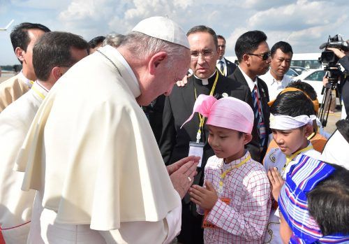 Rangun – Große Papst-Plakate hängen an Straßenlaternen, in der Menge sieht man unzählige T-Shirts mit dem Aufdruck „Love and Peace“. Und am Straßenrand rufen sie „Viva Papa“ – „Es lebe der Papst“. 30 000 Menschen sind gekommen, um Papst Franziskus in Myanmars