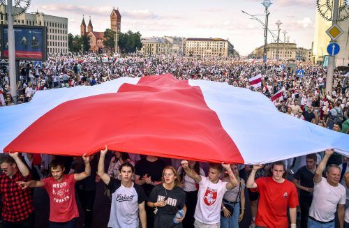 Minsk – Zu Fuß und unter dem Lärm von Autohupen wie bei einem gewonnenen Fußballspiel ziehen die Menschen ins Zentrum von Minsk zum bisher größten Protest gegen Alexander Lukaschenko. Sie tragen die historischen rot-weißen Fahnen von Belarus – ein Ausdruck nationalen Selbstbewusstseins. „Lukaschenko