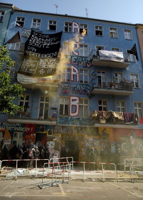 Berlin – Als die Beamten mit einer Motorsäge die erste Tür öffnen, zünden die Bewohner Bengalos. Die Einsatzkräfte öffnen auch eine zweite Eingangstür und verschaffen sich zudem über den Hof eines Nebengebäudes Zugang. Dort werden sie von Bewohnern mit Farbbeuteln beworfen und mit Feuerlöschmittel b