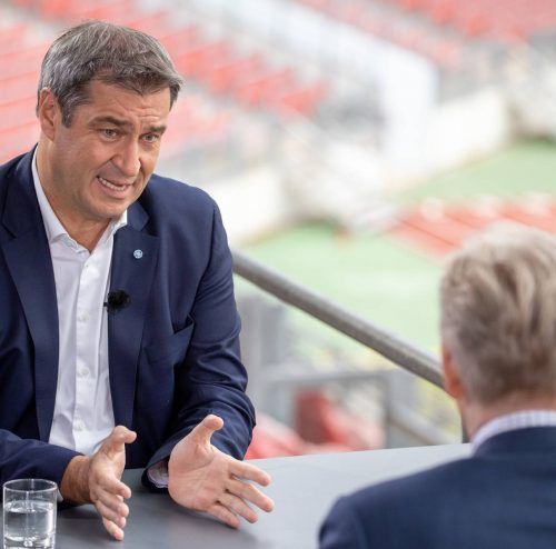 Nürnberg – Selten hat es in der Politik seltsamere Orte für ein Interview gegeben, aber worüber wundert man sich nach der Corona-Zeit noch? Also läuft Markus Söder am Sonntag in einem Stadion über die Tartanbahn, geht auf die Tribüne. Es ist die Nürnberger Arena, vor sich hat er dann ein Wasserglas,