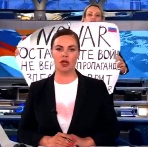 Moskau – Mit einem Protestplakat und lauten Rufen hat eine Kriegsgegnerin im russischen Staatsfernsehen für eine Unterbrechung der abendlichen Hauptnachrichten gesorgt. Während der Live-Übertragung am Montag um 21 Uhr Moskauer Zeit sprang die Frau hinter Nachrichtensprecherin Jekaterina Andrejewa in