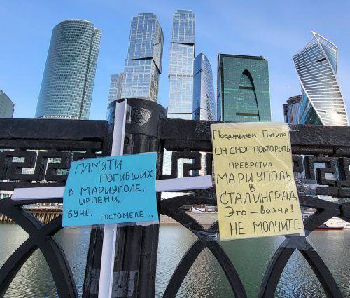 Moskau – Einen Tag nach der Entdeckung Hunderter ermordeter Zivilisten im ukrainischen Ort Butscha hängen im Moskauer Zentrum zwei Zettel am Zaun der Uferpromenade. „Das ist Krieg“, steht darauf. Und: „Schweigt nicht!“ Ein Zettel ist blau, der andere gelb – die Farben der Ukraine.