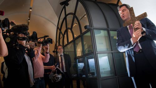 München – Markus Söder umfasst das Kreuz mit beiden Händen, grell flammen Blitzlichter der Fotografen auf, harte Schlagschatten an der Wand der Staatskanzlei: Selten verunglücken dem Ministerpräsidenten große Bildtermine so wie jener im April 2018.