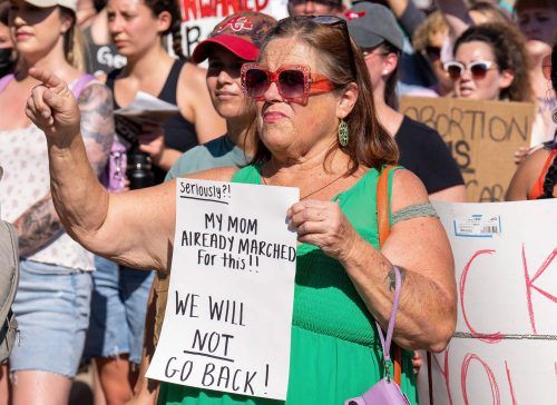 Washington – Geschrei. „Wir wollen keinen Gottesstaat“, brüllt ein Mann vor dem Supreme Court – dem Obersten Gericht der USA. Ein anderer mit einem Schild, auf dem „Jesus rettet“ steht, brüllt zurück. Die Stimmung ist aufgeheizt. Zuvor hat der Supreme Court das Recht auf Abtreibung gekippt. Im Land