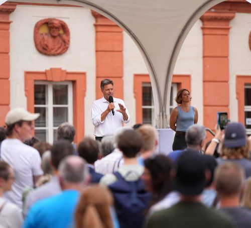 Bayreuth – Es ist ein lauer Sommerabend im Ehrenhof am Alten Schloss in Bayreuth. Die Restaurants und Cafés rundherum sind gut gefüllt, ein beschauliches Bild. Als aber Robert Habeck auf der kleinen Bühne im Ehrenhof auftaucht, ist es mit der Ruhe vorbei. „Hau ab“ schallt es dem W