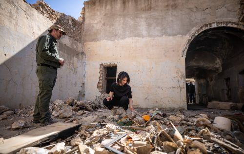 ln den TrümmernDie Außenministerin besucht den Irak: In den Trümmern der Stadt Sindschar spricht Annalena Baerbock mit einem Minenräumer. Sie verspricht den Jesiden deutsche Wiederaufbauhilfe. Foto: dpa