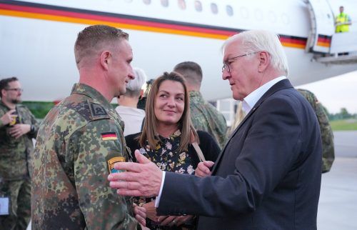 Berlin/Vilnius – Erst eine feste Umarmung, dann ein inniger Kuss und schließlich ein paar Freudentränen – auf dem Rollfeld des Flughafens in der litauischen Hauptstadt Vilnius spielen sich freudige Szenen ab. Während die Sonne gerade orange-rot versinkt, sehen zwölf hier stationierte Bundeswehr-Sold