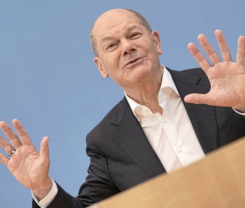 Berlin/München – Plötzlich ist Weihnachten. Olaf Scholz gibt gerade eine umständliche Antwort auf eine einfache Frage, als irgendwas im Saal die Melodie von „Jingle Bells“ pfeift, minutenlang. Der Kanzler stockt, grinst, gluckst dann ungehemmt vor sich hin. „Ich glaube, das ist j