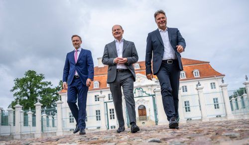 München/Meseberg – Da stehen sie wieder zusammen, alle drei. Der SPD-Kanzler Olaf Scholz, der grüne Vizekanzler Robert Habeck und der FDP-Finanzminister Christian Lindner. Hinter ihnen die Kulisse des brandenburgischen Schlosses Meseberg. Alles schon gesehen. Alles ganz ähnlich