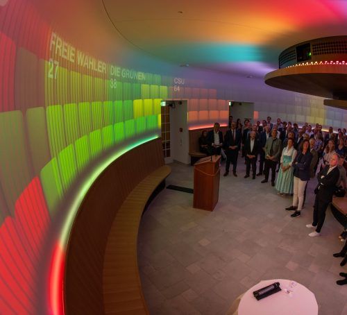 München – Löwen-Attacke im Landtag: Das Wappentier springt über die Wände des Parlaments, knurrend und fauchend – jedenfalls virtuell. Im neuen Besucherzentrum des Landtags toben die Löwen als Video-Animation auf den halbrunden Wänden. Das nagelneue Foyer wird so zum 180