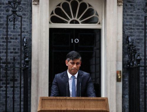 London – Rishi Sunak stand im Londoner Regen wie ein begossener Pudel – und wohl selten hat ein Bild die Lage eines Politikers so deutlic