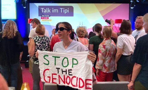 Tumulte im Saal: Eine Demonstrantin während einer Veranstaltung mit Außenministerin Baerbock. © dpa