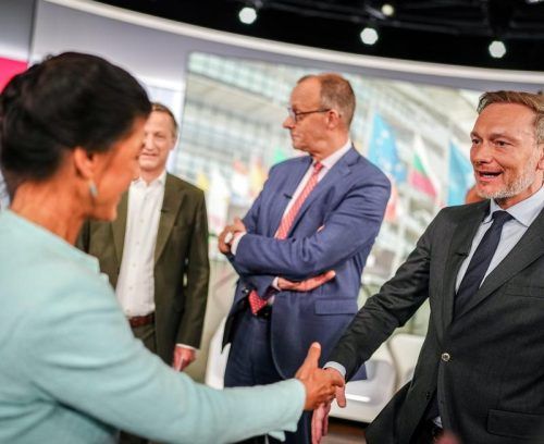 Schwieriges Miteinander: Nicht jeder in Berlin freut sich, wenn er Sahra Wagenknecht trifft. Friedrich Merz (m.) nicht, Christian Lindner schon eher. © dpa/Nietfeld