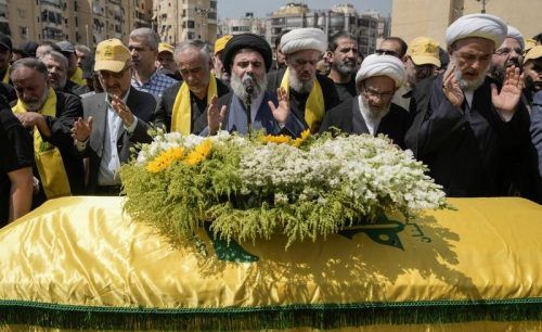 Der getötete Hisbollah-Kommandeur wurde im Beisein von hunderten Trauergästen in Beirut beigesetzt. © dpa/Hussein
