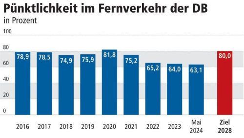 München – Fernzüge der Deutschen Bahn sind zuletzt wieder unpünktlicher unterwegs gewesen. Im Mai kamen lediglich 63,1 Prozent der IC- und ICE-Züge der Bahn ohne größere Verzögerung ans Ziel, wie der Konzern am Samstag in Berlin mitteilte. Im April lag die Quote bei 64,3 Prozent, im März noch bei 67
