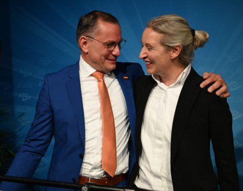 Unzertrennlich? Beim Parteitag dürfte vor allem Tino Chrupalla Kritik einstecken müssen. Alice Weidel stellt sich vorsorglich schützend vor ihn. © Ralf Hirschberger/afp
