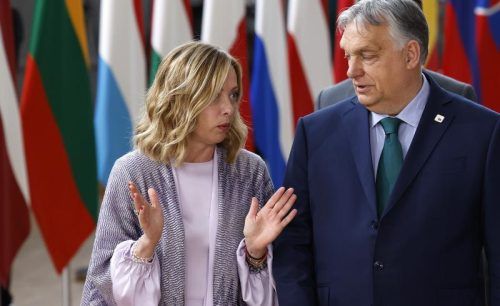 Scharfe Kritiker des Personalpakets: Viktor Orban (Ungarn) spricht mit Giorgia Meloni (Italien). © Wijngaert/AP/dpa