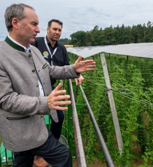 Hubert Aiwanger 2023 neben einer Hopfen-Agri-Photovoltaik-Anlage. © dpa