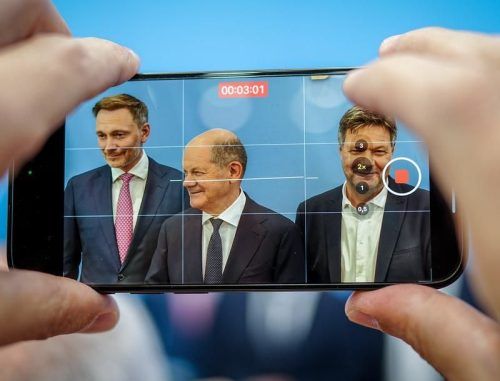 Im Fokus: Olaf Scholz (SPD, M.), Robert Habeck (Grüne, re.) und Christian Lindner (FDP) wirken am Morgen nach der letzten Verhandlungsnacht erleichtert. © Nietfeld/dpa