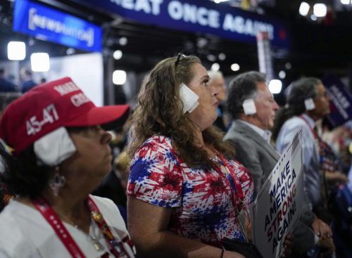 Sie sind ganz Ohr: Republikanische Delegierte zeigen in Milwaukee ihre Verbundenheit mit Donald Trump. © dpa/Hong