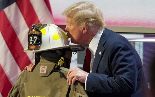 Große Gesten: Donald Trump küsst den Helm von Corey Compertore, dem Feuerwehrmann, der bei der Wahlkampfveranstaltung in Pennsylvania vor einer Woche erschossen wurde. © dpa/Arbogast