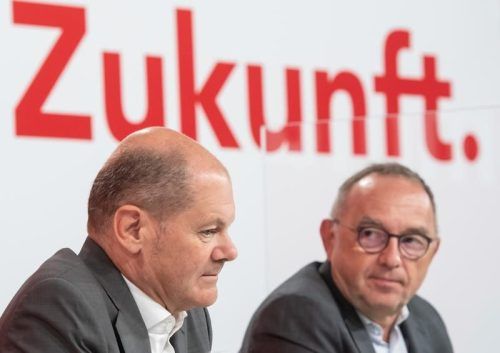 Mahnende Wort von Ex-SPD-Chef Norbert Walter-Borjans (re.): Olaf Scholz sollte den Menschen zugewandter erklären, warum er der Friedenskanzler für Deutschland ist. © Bernd Thissen/dpa