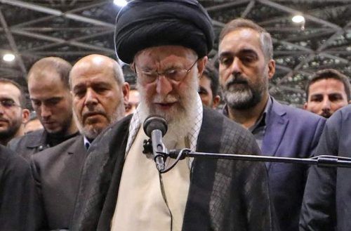 Ajatollah Ali Chamenei spricht am Sarg von Hamas-Führer Isamil Hanija. © AFP